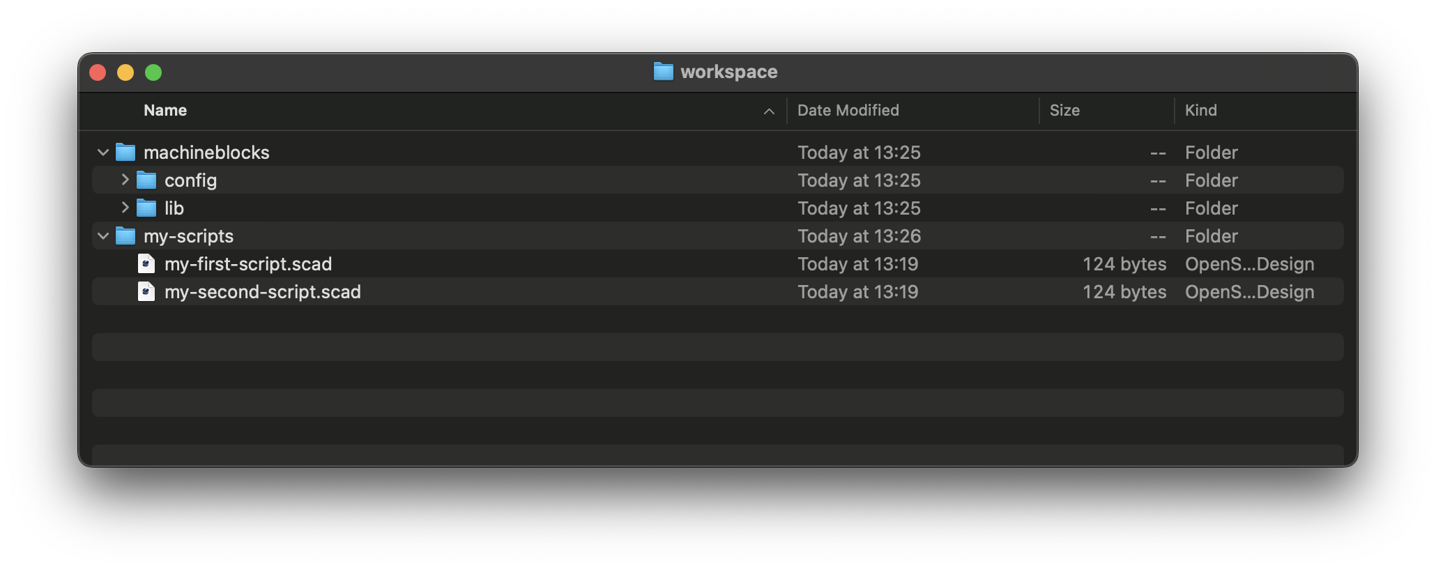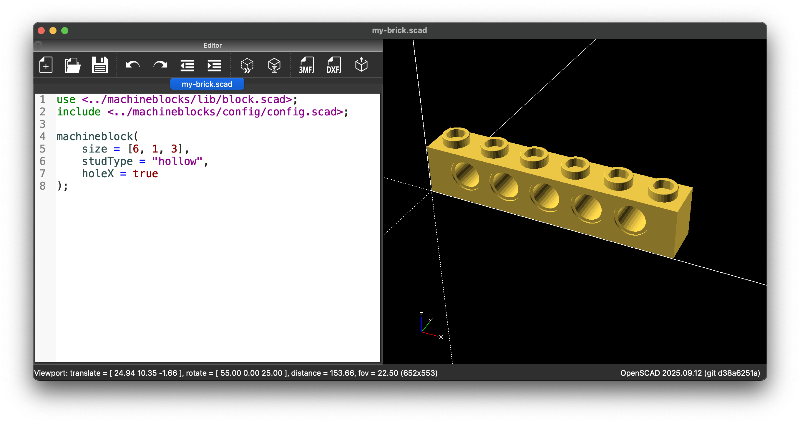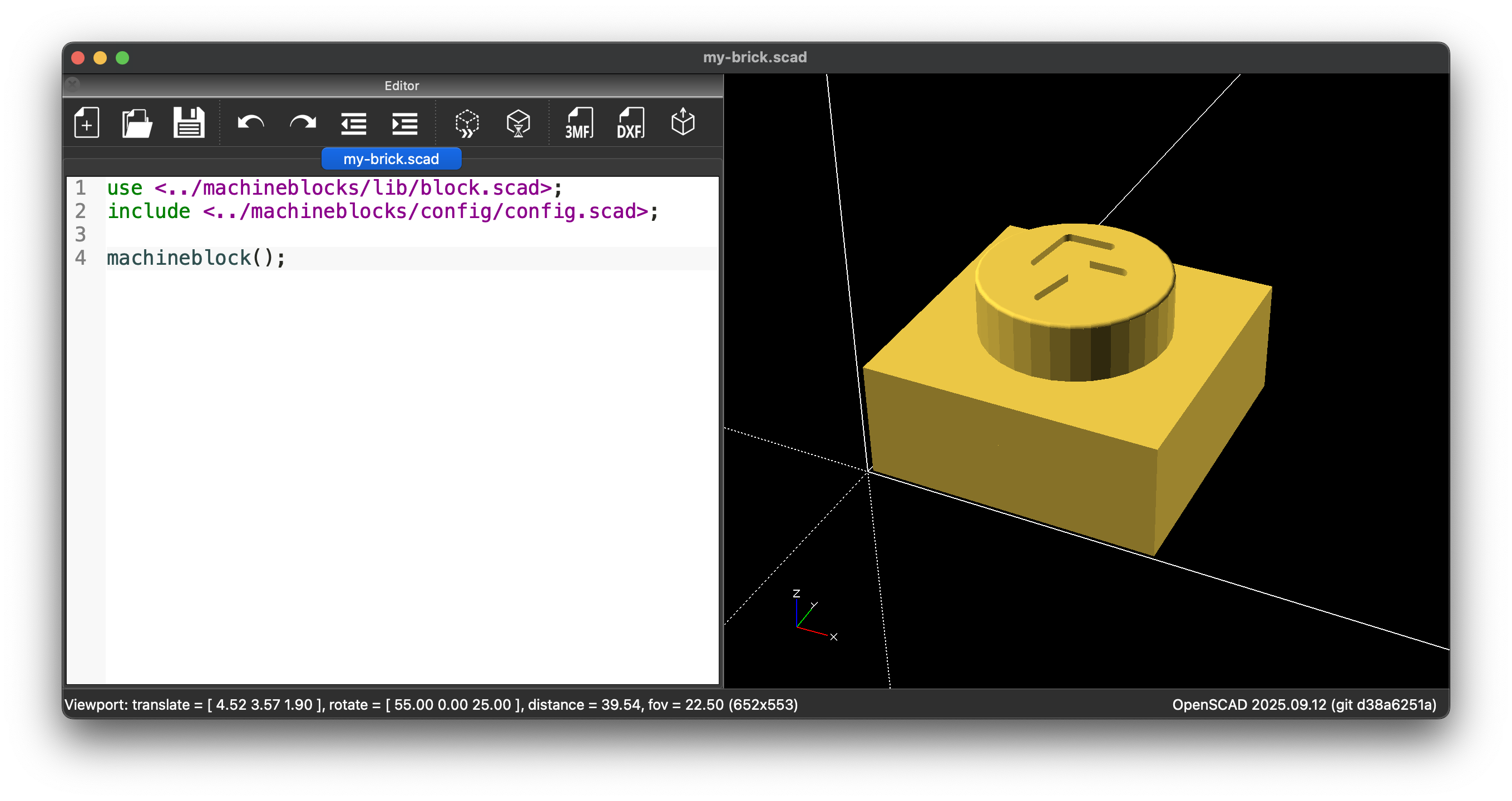 include <../machineblocks/config/config.scad>;- The use statement loads the main library file (block.scad), which contains the definitions of the building blocks and functions provided by the MachineBlocks framework.