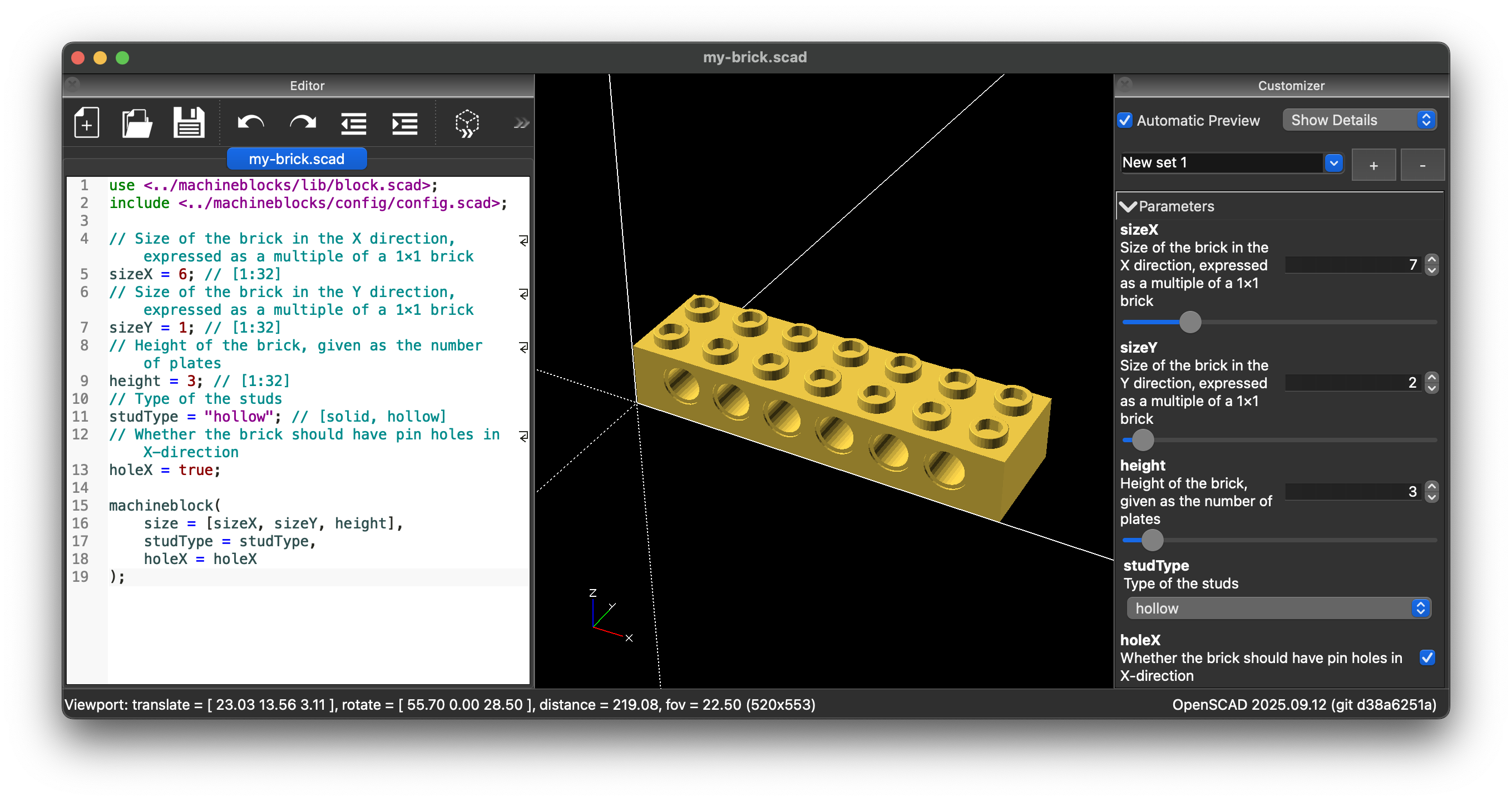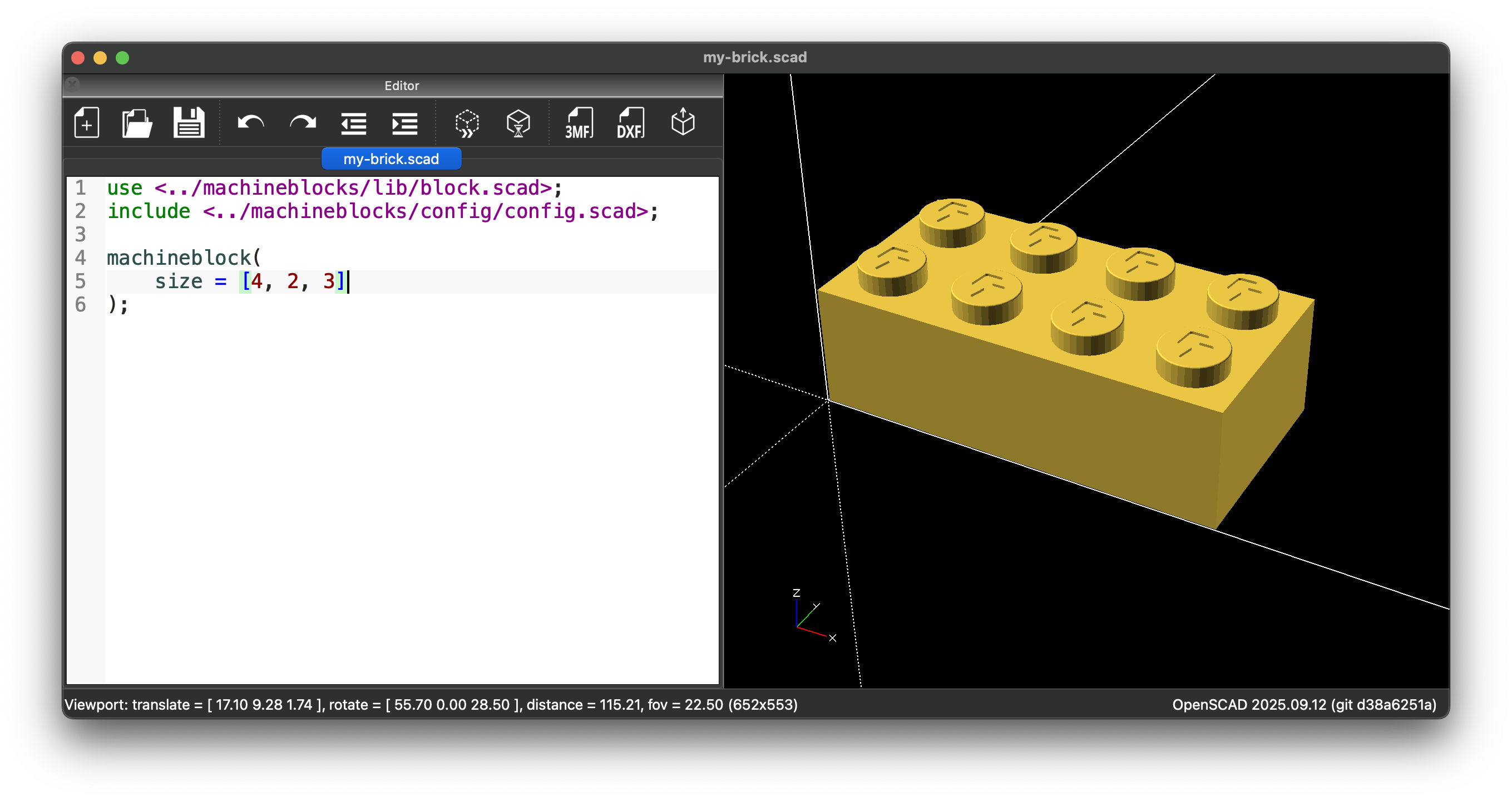 Instead of entering parameter values directly into the machineblock() call, you can define variables and reference them in the module call. This approach makes your script dynamic and customizable — each variable will automatically appear in OpenSCAD’s Customizer panel, along with its description and allowed values.